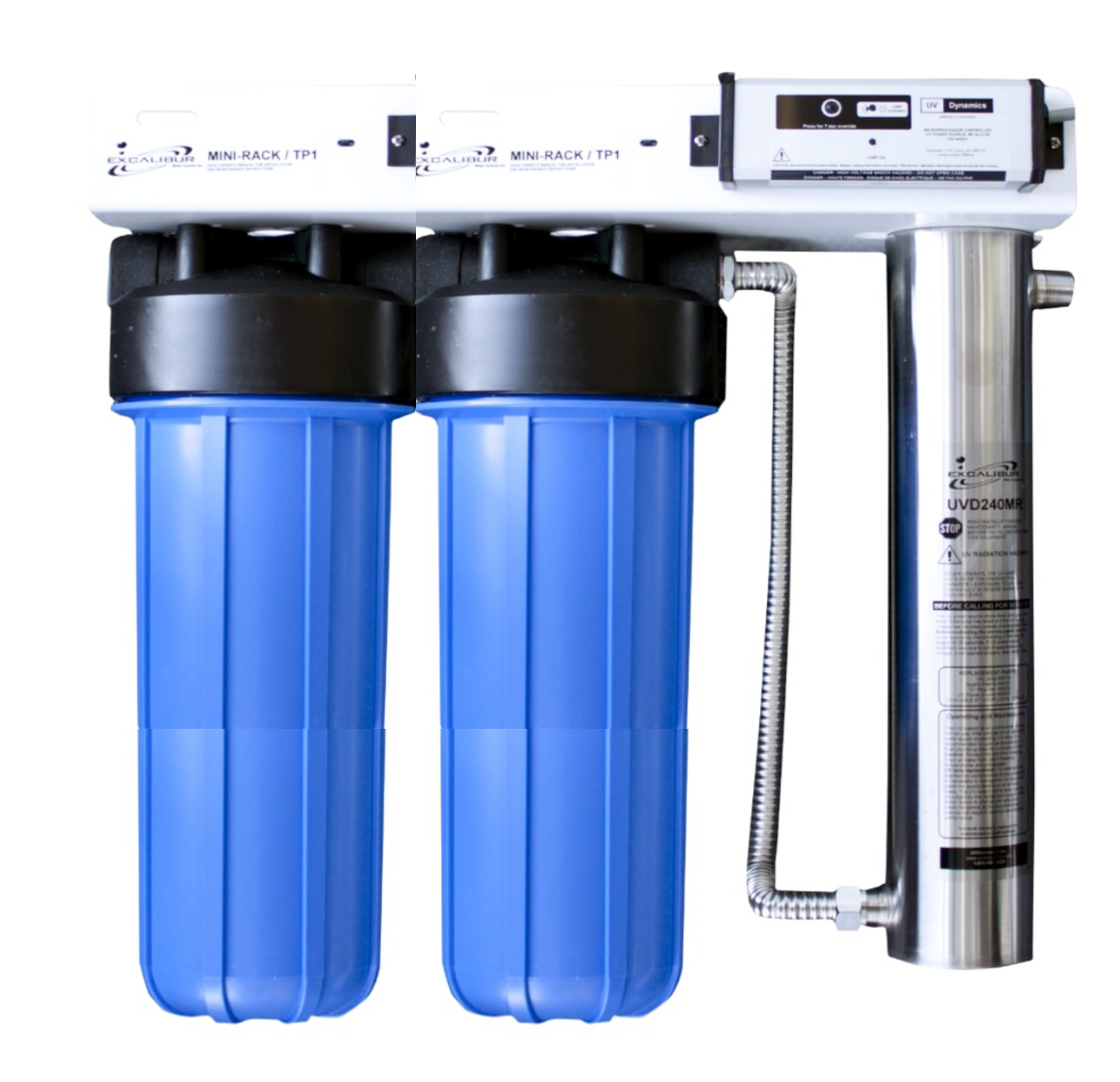 Le système ultraviolet haut de gamme Excalibur Water Systems, d'un débit de 10 gpm à 40 000 mJ, est entièrement assemblé et prêt à être installé. Son rendement est équivalent à celui d'un système UV certifié NSF.